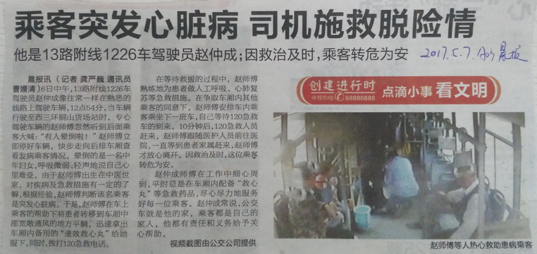 當(dāng)天中午,13路附線1226車駕駛員趙仲成像往常一樣在熟悉的線路上駕駛車輛。12點54分,當(dāng)車輛行駛至西三環(huán)銅山貨場站時,專心駕駛車輛的趙師傅忽然聽到后面乘客大喊:“有人暈倒啦”,趙師傅立即停好車輛、快步走向后排車廂查看發(fā)病乘客情況,暈倒的是一名中年婦女,呼吸微弱、輕聲地說自己心里難受。由于趙師傅出生在中醫(yī)世家,對疾病及急救措施有一定的了解,根據(jù)經(jīng)驗,趙師傅判斷該名乘客是忽發(fā)心臟病,于是,趙師傅在車上乘客的幫助下將患者轉(zhuǎn)移到車廂中部寬敞通風(fēng)的地方平躺,迅速拿出車廂內(nèi)備用的“速效救心丸”給她服下,同時,撥打120急救電話。在等待救援的過程中,趙師傅熟練地為患者做人工呼吸、心肺復(fù)蘇等急救措施。在爭取車廂內(nèi)其他乘客的同意下,趙師傅安排車內(nèi)乘客乘坐下一班車,自己等待120急救車的到來。10分鐘后,120急救人員趕來,趙師傅跟隨醫(yī)護人員前往醫(yī)院,一直等到患者家屬趕來,趙師傅才放心的離開。