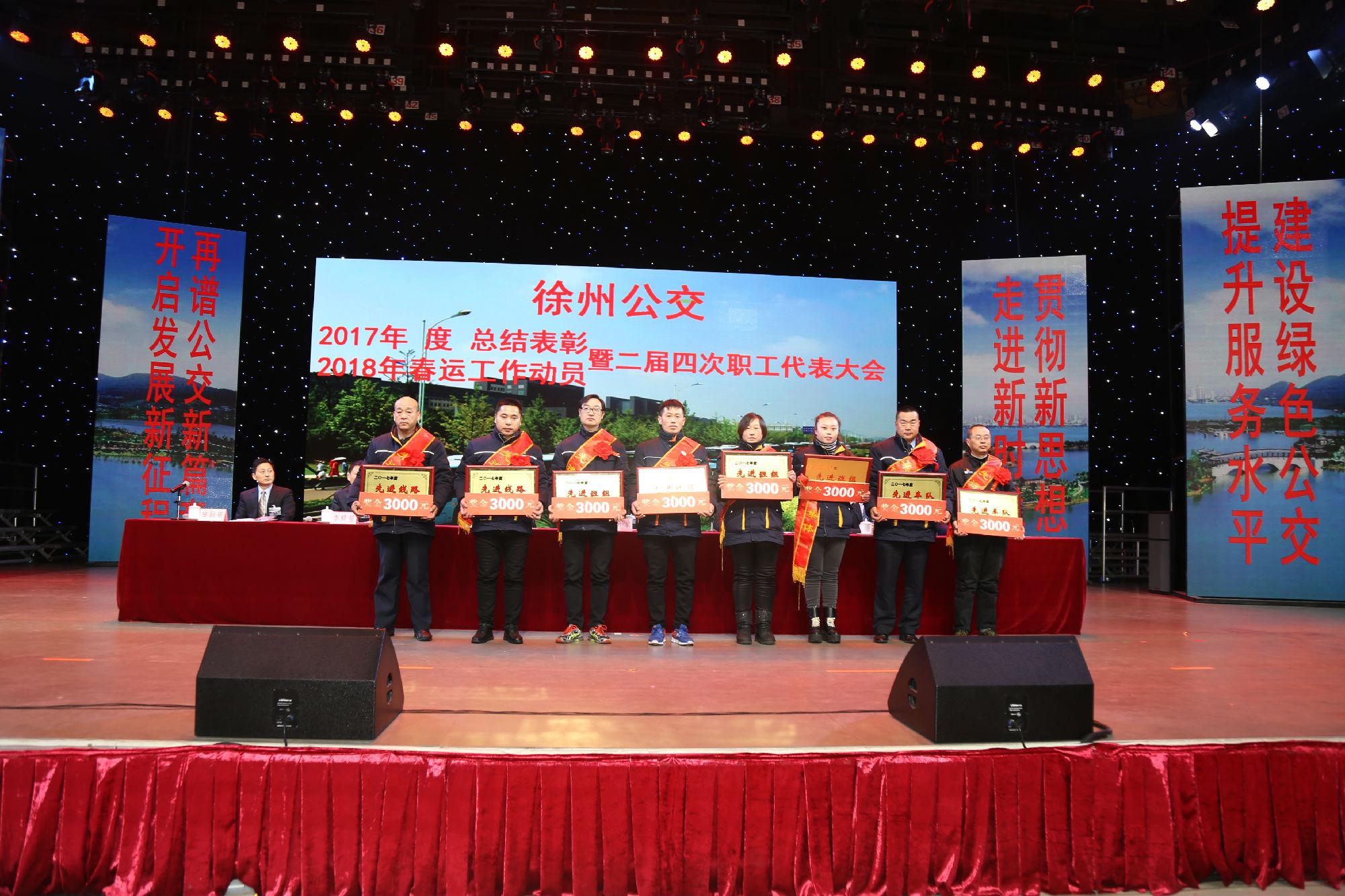 大會(huì)在莊嚴(yán)的國歌聲中拉開序幕。公司董事長、總經(jīng)理杜紅軍首先作經(jīng)理工作報(bào)告,對(duì)2017年“改革創(chuàng)新年”工作進(jìn)行了全面總結(jié):一、實(shí)施“同城同價(jià)”,優(yōu)化運(yùn)營管理,實(shí)現(xiàn)服務(wù)水平新突破。連續(xù)第五年面向全市征集線路線網(wǎng)優(yōu)化意見近3000條,據(jù)此新辟優(yōu)化線路29條。二、深化資源共享,在互聯(lián)網(wǎng)+企業(yè)管理上譜寫新藍(lán)圖。繼續(xù)深化集中維修,推行集中例檢。論證實(shí)施支付寶、微信、銀行卡閃付等智能化移動(dòng)支付方式。三、深化文明創(chuàng)建,打造優(yōu)秀公交,服務(wù)民生出行贏得新口碑。在國檢、省檢中未失一分,圓滿完成創(chuàng)建驗(yàn)收任務(wù)。投訴總數(shù)和有責(zé)投訴同比實(shí)現(xiàn)“雙下降”。乘客表揚(yáng)同比上升近20%。公司在2016年行風(fēng)熱線上線單位滿意度評(píng)議投票中名列榜首。率先打造公交行業(yè)禮讓斑馬線嶄新形象,圓滿完成公交反恐防暴工作。四、著力綜合管理,聚合內(nèi)生動(dòng)能,增強(qiáng)企業(yè)發(fā)展新優(yōu)勢(shì)。重新修訂2012版管理制度匯編和新版《徐州公交獎(jiǎng)懲條例》。五、踐行十九大精神,推進(jìn)和諧發(fā)展,開創(chuàng)黨群工作新面貌。接著,杜總分析了工作中存在的問題,提出下步工作重點(diǎn)。一、建設(shè)現(xiàn)代化公交,提升經(jīng)營管理水平,保障企業(yè)良性有序運(yùn)行;二、踐行集約共享理念,深化科技應(yīng)用,開創(chuàng)公交事業(yè)發(fā)展新局面;三、建設(shè)平安公交,提升服務(wù)口碑,展示文明公交新形象;四、踐行十九大精神,構(gòu)建和諧公交,開啟黨群工作新面貌。